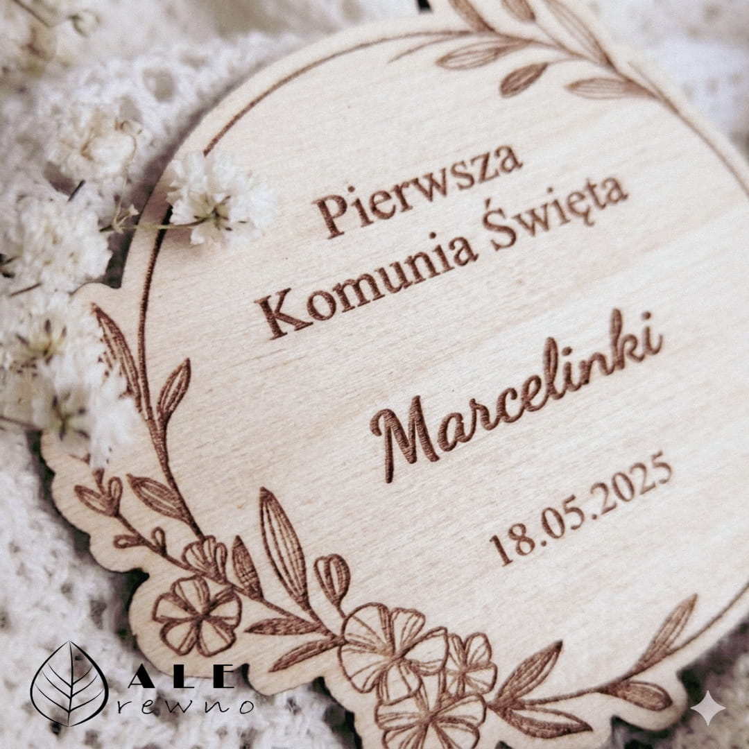Pierwsza Komunia Święta to wyjątkowe wydarzenie, którym chcemy dzielić się z najbliższymi. Nasze podziękowanie dla gości na Komunię magnes to subtelny, a zarazem niezwykle trwały sposób na wyrażenie wdzięczności za wspólnie spędzone chwile. Wykonany z naturalnego, jasnego drewna magnes wyróżnia się nieregularnym, ozdobnym kształtem oraz delikatnym grawerem gałązki z kwiatami, co nadaje mu lekkości i elegancji. To drobny gest, który sprawi, że Wasi goście poczują się docenieni, a pamiątka z uroczystości zagości w ich domach na dłużej.