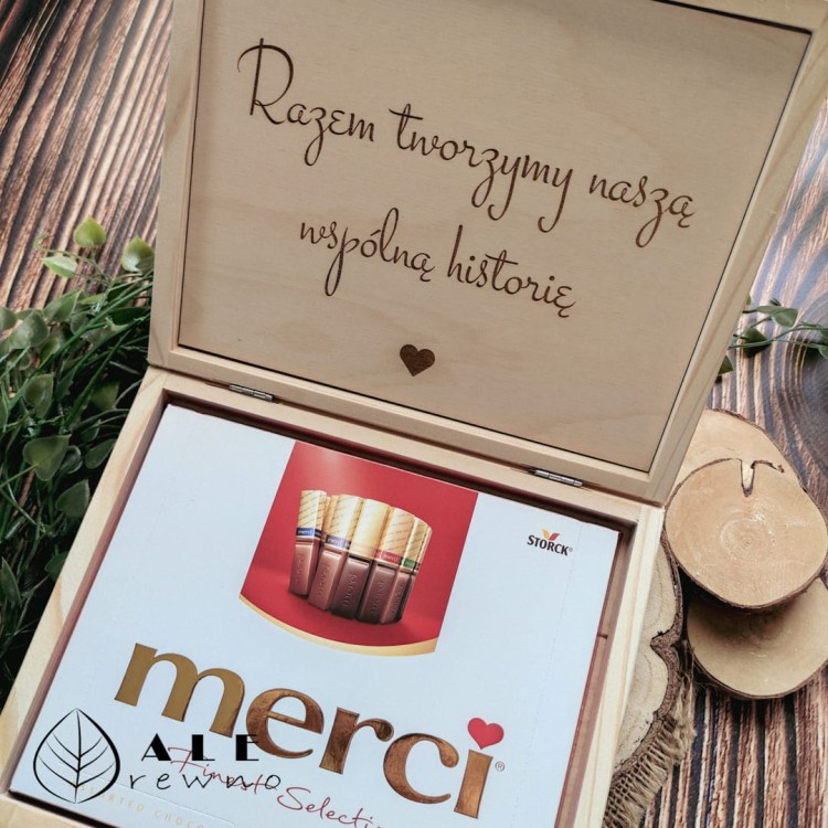 Drewniane pudełko na czekoladki Merci – idealny prezent na Walentynki! ❤️ Produkt sprzedawany bez czekoladek.