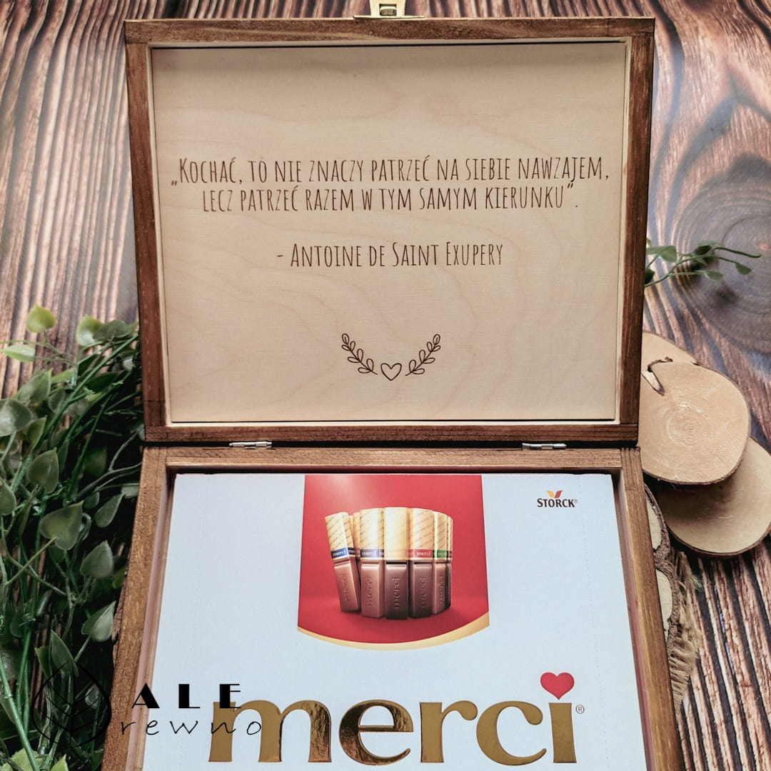 Drewniane pudełko na czekoladki Merci – idealny prezent na Walentynki! ❤️ Produkt sprzedawany bez czekoladek.